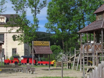 Im Shop bzw. bei hier aufgestellten Automaten erhalten Sie auch Eis und Getränke. Direkt im Anschluss daran befindet sich eine schönen Terrasse im Freien, von der aus Sie den gärtnerisch gestalteten Bereich des Geländes mit dem großen Eisenbahn- und Bergbau-Erlebnisspielplatz überblicken können, der exklusiv den kleinen Besucherinnen und Besuchern unseres Museums zur Verfügung steht. Hier kommen Kinder ganz auf ihre Kosten. Natürlich dürfen die üblichen Spielgeräte wie Schaukeln und Klettergerüste nicht fehlen - eine Seilbrücke, ein acht Meter hoher Turm mit einer Röhrenrutsche und ein großes Kletternetz sind bei den Jüngsten besonders beliebt.