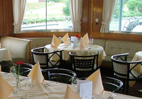 ausgelegt ist. Hinter dem Kamin finden 35 Personen in der Cafeteria mit eigener Ausschank Platz. Anschließend ist im rückwärtigen Bereich ein verglaster Wintergarten (Bild links) für 64 Personen